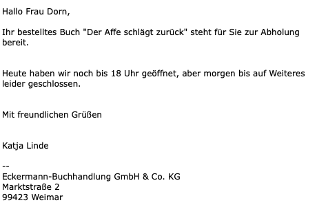 Seit heute sind die Geschäfte geschlossen. Ich hatte in der Eckermann-Buchhandlung ein Buch bestellt: