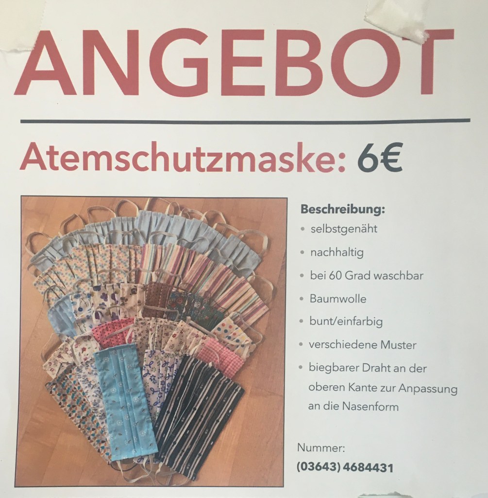Am Ausgang war ein Aushang mit einem Angebot für bunten selbst genähten Mundschutz.