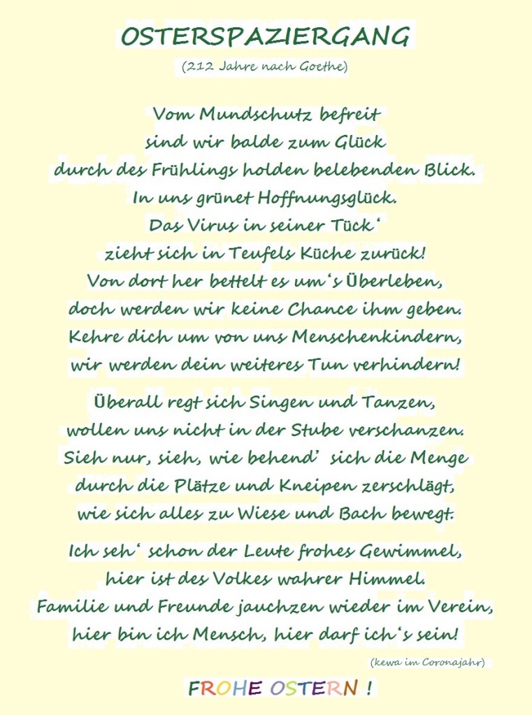 Bei mir sieht nun fast jeder Tag gleich aus. Inzwischen hat sich auch ein Tagesrhythmus eingestellt. Karfreitag war deshalb kein besonderer Tag für mich. Michael fährt täglich auf sein Amt und für ihn ist Ostern ein verlängertes Wochenende. Es ist dann oft schwierig sich auf gemeinsame Unternehmungen zu einigen. Ich schlage dann vor, einfach mal auf den Goethewanderweg zu gehen und bis auf den Kammweg oder bis Belvedere oder noch weiter zu laufen und dabei zu quatschen. Er will sich aber meist ins Auto setzen und was anderes sehen oder joggen oder mit dem Fahrrad auf den Ettersberg fahren. Ich entgegne dann, dass es doch egal ist, in welchem schönen Wald wir uns bewegen und unterhalten, joggen nicht gut für die Gelenke ist und er mich am steilen Ettersberg abhängt und wir uns dann auch nicht unterhalten können. Dann ruft er meist Matthias an und macht mit ihm richtigen Männersport. Manchmal ist er dann für Stunden und Tage erschöpft und es tun ihm das Handgelenk oder das Knie weh. Ich gehe lieber mit Hermine auf unseren Hausberg. Wir wählen jedesmal eine andere Route und sehen auch jedesmal was Neues.
