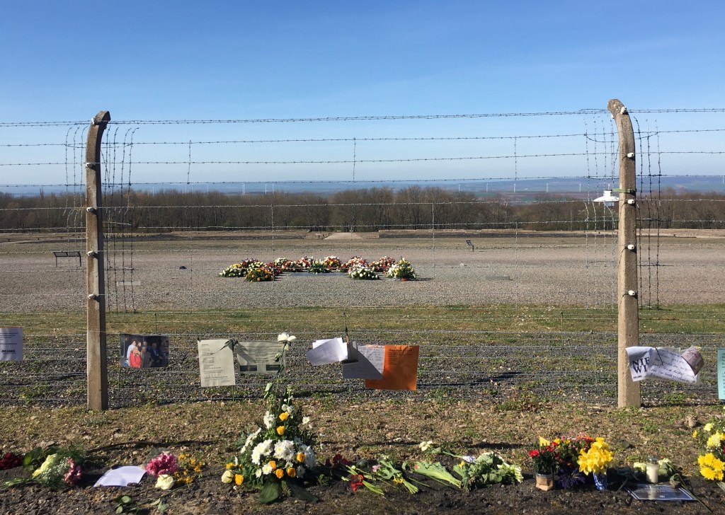 In Buchenwald wurden heute nur ein paar Kränze im Lagerbereich niedergelegt und am Lagerzaun legten Besucher Blumen und sehr persönliche Texte nieder.